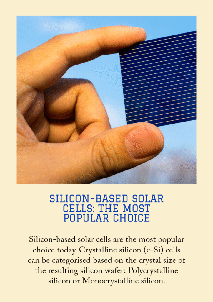 Silicon-based solar cells are the most popular choice today. Crystalline silicon (c-Si) cells can be categorised based on the crystal size of the resulting silicon wafer: